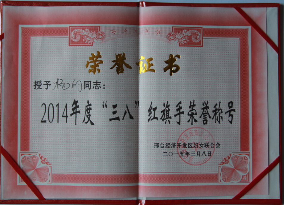 為隆重紀(jì)念“三八”國際勞動(dòng)?jì)D女節(jié),邢臺(tái)市開發(fā)區(qū)婦聯(lián)特舉辦“三八”紅旗集體和“三八”紅旗手的評(píng)比表彰活動(dòng),我公司員工楊麗榮獲開發(fā)區(qū)“三八紅旗手”稱號(hào)。