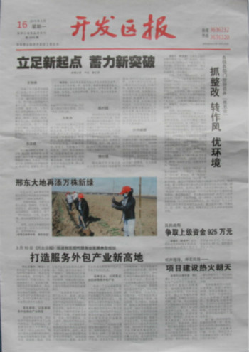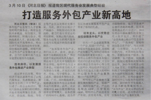 邢臺(tái)眾聯(lián)科技服務(wù)有限公司作為邢臺(tái)市服務(wù)外包產(chǎn)業(yè)的龍頭企業(yè),于3月10日分別在《河北日?qǐng)?bào)》第07版中國(guó)?國(guó)際版面及邢臺(tái)《開(kāi)發(fā)區(qū)報(bào)》頭版以“打造服務(wù)外包產(chǎn)業(yè)新高地”為題,刊登了眾聯(lián)科技發(fā)展服務(wù)外包產(chǎn)業(yè)新聞。文中提到眾聯(lián)科技將充分發(fā)揮服務(wù)外包產(chǎn)業(yè)的帶頭作用,積極帶動(dòng)邢臺(tái)經(jīng)濟(jì)開(kāi)發(fā)區(qū)服務(wù)外包產(chǎn)業(yè)的蓬勃發(fā)展。