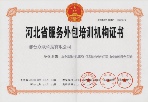 《河北省服務(wù)外包培訓(xùn)機構(gòu)證書》的獲得,不僅為眾聯(lián)科技長期發(fā)展服務(wù)外包產(chǎn)業(yè)增加了更多的信心,同時也為同樣從事服務(wù)外包企業(yè)的同行們培育更多、更優(yōu)秀的服務(wù)外包人員奠定了基礎(chǔ)。