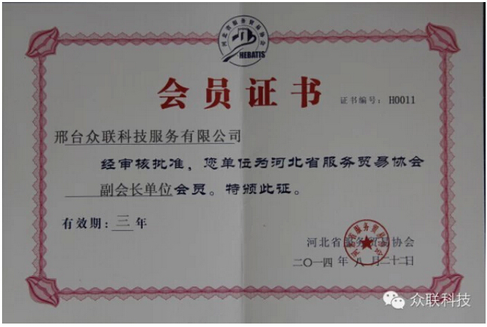 河北省服務貿(mào)易協(xié)會在對邢臺眾聯(lián)科技服務有限公司進行規(guī)模、信譽度等各方面情況進行嚴格審查后,認定邢臺眾聯(lián)科技服務有限公司符合協(xié)會會員資格,并頒發(fā)了河北省服務貿(mào)易協(xié)會副會長單位會員證書,這標志著眾聯(lián)科技在服務外包行業(yè)邁向了一個新的臺階。